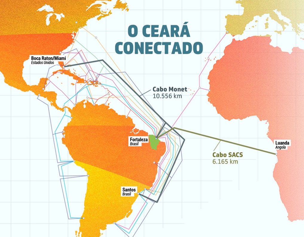 A inauguração do Data Center da multinacional de telecomunicações Angola Cables em abril deste ano foi um outro importante passo dado pelo Ceará rumo ao protagonismo no setor de TIC. A empresa angolana investiu cerca de US$ 300 milhões na construção de um Data Center, na Praia do Futuro, e na instalação dos cabos submarinos Sacs e Monet, que ligam via fibra óptica duas regiões com grande potencial econômico – Américas e África, gerando uma rota alternativa de conectividade com os Estados Unidos e o continente asiático.