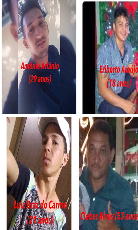 Com as diligências, os agressores foram identificados e localizados pela POLÍCIA CIVIL e compareceram na Delegacia para serem interrogados e prestarem esclarecimentos. Os indivíduos CLEBER ALVES DA SILVA (53 anos), ANTÔNIO ARLANIO DA SILVA ALVES (29 anos), LUIZ BRAZ DO CARMO FILHO (21 anos) e ERIBERTO ARAÚJO DO CARMO (18 anos) foram reconhecidos como sendo os agressores e ao final das investigações foram INDICIADOS pelos crimes de Tentativa de Homicídio e Associação Criminosa e responderão pelos crimes cometidos na Justiça da Comarca de Iguatu/CE.