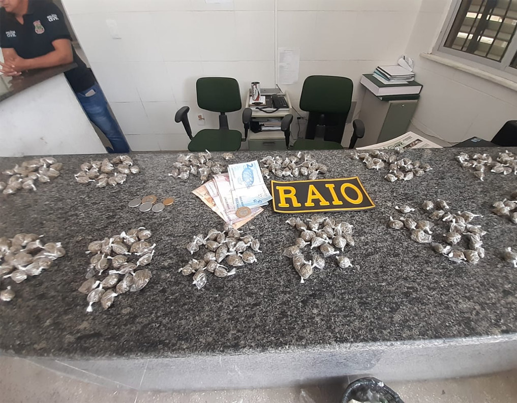 Neste fim de semana,21, por volta das 10h20min, uma equipe do RAIO em patrulhamento pela Rua José Rosa da Matos, Bairro João Paulo II, Iguatu; abordou dois indivíduos em atitudes suspeitas, após os mesmos visualizarem a equipe RAIO e tentarem fugir; que na tentativa de fuga jogaram uma sacola num matagal; que foi encontrada pela equipe e na sacola continha 280 trouxinhas de maconha pesando 220 gramas.