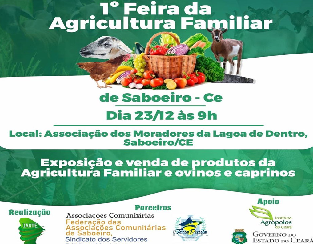 Convidamos a todos Agricultura Familiar de Saboeiro/CE, que acontecerá no dia 23 de dezembro de 2019 na Sede da Associação dos Moradores da Lagoa de Dentro. Na ocasião, teremos exposição e venda de produtos da agricultura familiar, ovinos e caprinos.