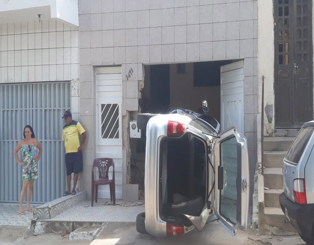 Um veículo tombou na garagem de uma residência após o condutor perder o controle e invadir o local. O acidente aconteceu na rua Sargento George Teles Sampaio, no bairro Independência, no município do Crato, na tarde deste domingo (26).