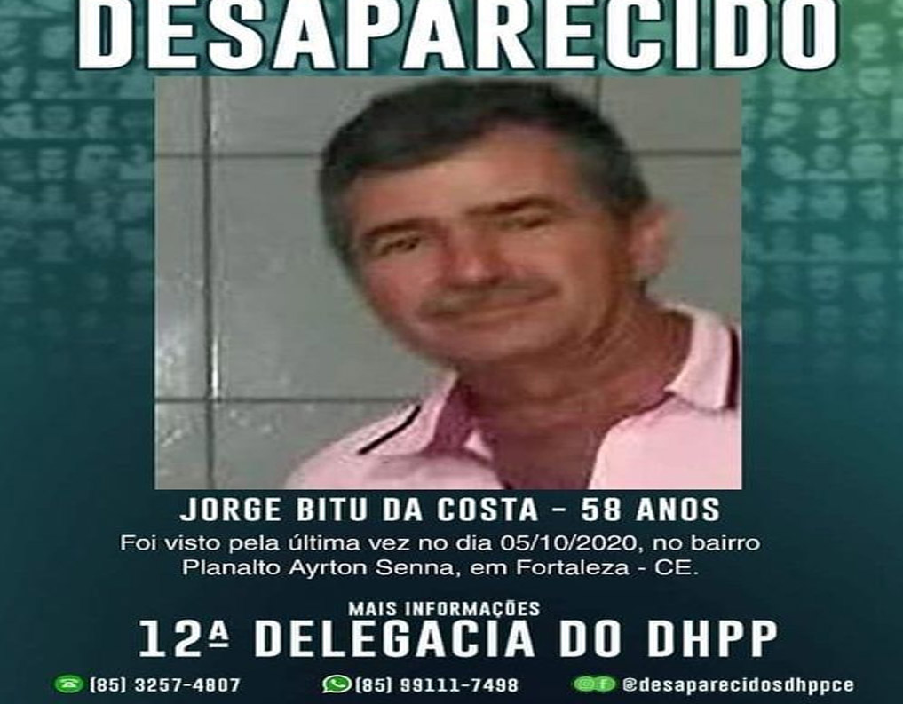 Jorge Bitu da Costa tem 58 anos e foi visto pela última vez na tarde do dia 05 de outubro, quando o mesmo saiu do Planalto Ayrton Senna em Fortaleza para o município de Horizonte, numa caminhonete tipo Hylux de cor prata, segundo informações da Família o mesmo não chegou ao seu destino, não retornou para Fortaleza e nem deu mais notícia.