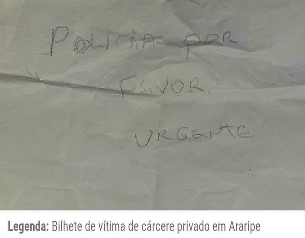 A PMCE foi acionada por um popular que afirmava ter um bilhete, recebido por uma criança, de uma mulher que estava sendo mantida em cárcere privado. No papel estava escrito: *“Polícia, por favor, urgente”*.