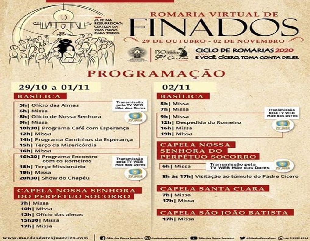 A maior romaria de Juazeiro do Norte e uma das maiores manifestações religiosas do nordeste, a Romaria de Finados neste ano ocorre de forma online com programação virtual iniciada nesta quinta (29). Contudo, na segunda-feira (2), Dia de Finados, a visitação ao túmulo de Padre Cícero, na Capela Nossa Senhora do Perpétuo Socorro, estará aberta das 8h às 17h.