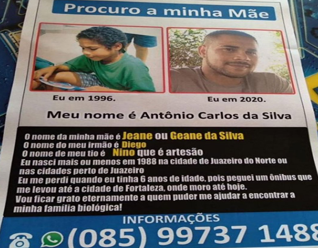 Segundo conta Antônio Carlos, a mãe dele faleceu em fevereiro de 2017, vítima de câncer de mama. Entretanto, o jovem conseguiu notícias da avó e dos quatro irmãos, entre eles Diego, citado no anúncio. “Eles são naturais de Antonina do Norte Ceará. Minha mãe morou em Pontegi e por último em um distrito de Petrolina-PE”, afirmou.