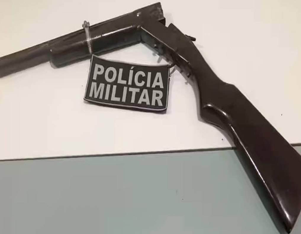 A arma apreendida num matagal próximo a uma casa abandonada localizada nas imediações de onde mora o suspeito no Sítio Bananeira, em Caririaçu FOTO REDES SOCIAIS