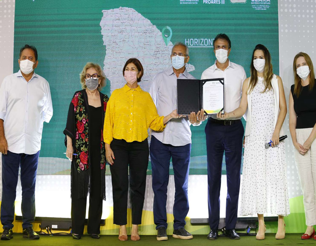 Ao lado do governador do Ceará, Camilo Santana, estiveram a primeira-dama do Ceará, Onélia Santana, a secretária da Proteção Social, Justiça, Mulheres e Direitos Humanos (SPS), Socorro França, o titular da Superintendência de Obras Públicas (SOP), Quintino Vieira, a Assessora Especial do Governador, Janaína Farias, e a secretária-executiva da SPS, Lia Gomes.