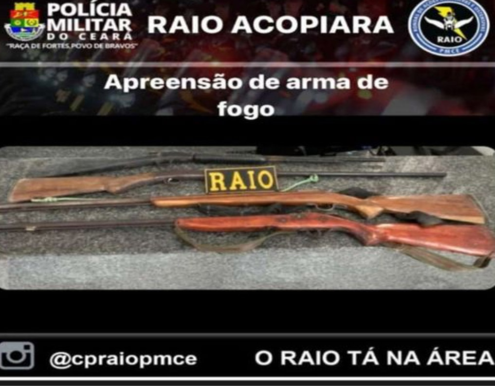 Uma ação realizada, nesse sábado (11), pela Polícia Militar do Ceará (PMCE) resultou na apreensão de quatro armas de fogo na localidade de Sítio Baixa do Retiro, zona rural de Acopiara-CE. Na ofensiva, foi apreendido um rifle calibre 22, uma espingarda calibre 36 e duas espingardas de fabricação artesanal.