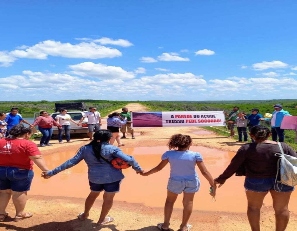 Um abraço simbólico e falas de indignação foram as formas que moradores e presidentes de associações do distrito de Suassurana e de outras comunidades acharam para protestar cobrando conserto da parede do açude Dr. Carlos Roberto Costa, o Trussu.