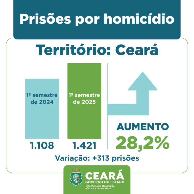 Com relação aos Crimes Violentos Letais e Intencionais (CVLI), o trabalho investigativo e o policiamento ostensivo das Forças de Segurança do Ceará resultaram no aumento de 28,2% nas capturas – tanto por auto de prisão em flagrante, como por cumprimento de mandado de prisão -, no primeiro semestre de 2025. O estado encerrou os seis primeiros meses deste ano com 1.421 prisões de suspeitos de envolvimento em mortes violentas, sendo 313 a mais do que no mesmo período de 2024, quando houve 1.108 capturas.
